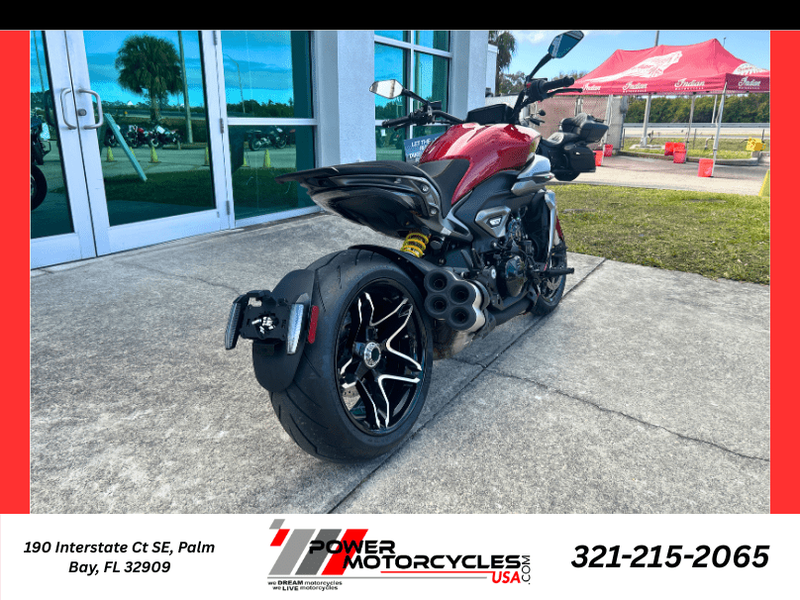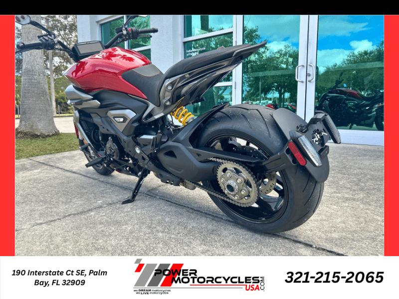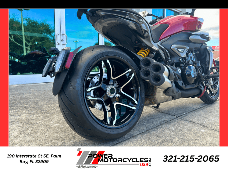 • 240 mm rear wheel with 5-spoke rim: The single-sided swingarm draws attention to the rear wheel, which mounts the imposing 240/45 Pirelli Diablo Rosso III tire. The rim's five spokes form a star, reinforcing the reference to American muscle cars.